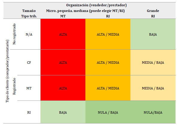 En resumen, las celdas rojas y naranjas de la tabla 3 representan las combinaciones con mayor propensión a la informalidad donde las operaciones se conciertan entre compradores no registrados, consumidores finales o monotributistas y vendedores mipymes (MT o RI). Por su parte, las celdas naranja claro y verdes muestran los casos de menor propensión a la subfacturación, donde interviene la figura del RI ya sea como cliente -con incentivo a computarse el crédito fiscal de la factura- o como un vendedor de tamaño grande -con alto costo administrativo por subfacturar o con obligación de actuar como agente de recaudación-.