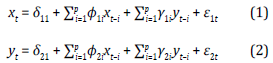 Causality tests in Granger's (1969) sense can be performed, and IRFs can be estimated. Granger (1969) developed a test to determine whether the past behavior of one variable (xt) could predict the behavior of another variable (yt). Thus, if this occurred, it was said that xt caused yt in Granger's sense. According to this, and given that the variables were endogenous, an unidirectional causality can occur from xt to y, unidirectional causality fromyt to x, and a bidirectional causality between xt andyt when the variables were caused simultaneously. Formally, the causality model was very similar to the one in Equations 1 and 2 for the VAR model. Thus, yt caused xt provided that any фi was not zero; whereas, xt causedyt provided that any é¡ was not zero. On the other hand, IRFs allowed to know the response of a variable before exogenous impulses or innovations in another variableyt (Lütkepohl, 2005). In this case, variables were expressed in terms of the present value and the past value of random perturbations of themselves or other variables.