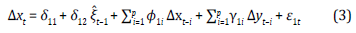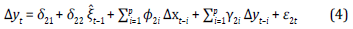 If the series had a long-term relationship, estimating a VEC model to find the short-term relationships among the variables would be possible. According to Engle and Granger's (1987) representation theorem, if there was a long-term relationship among variables, how variables in the short term adjust against imbalances in the long term could be found. Thus, the VEC model demonstrates how a variable changes depending on its past values and those of other variables and random shocks in the previous period, as Equations 3 and 4 show, where