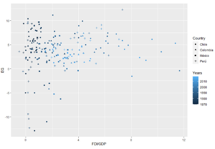 This paper empirically analyzes the relationship between FDI and EG in the countries of the Pacific Alliance (PA). The PA is an initiative of regional economic integration comprised of Chile, Colombia, Mexico, and Peru, which seeks to promote further growth, development, and competitiveness of the participating economies. Chile is one of the most stable and developed countries in Latin America. Its economy is open and market-oriented, with a strong focus on the export of primary products, especially copper. This country has favorable backgrounds such as i) low inflation, prudent fiscal policies, and a robust financial system; ii) relatively well-developed infrastructure; iii) a high level of education and workforce training compared to other countries in the region. However, it faces challenges such as a significant dependence on mining, especially copper, and a high level of inequality (Raffo López et al., 2018).