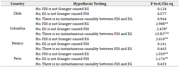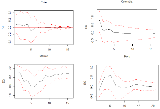 Table 5 shows that in Chile, FDI and EG did not have a causal relationship in Granger's (1969) sense. On the other hand, in Colombia, there was a bidirectional causal relationship between FDI and EG with a significance level of 5 %. In Mexico, there was a unidirectional causal relationship that went from FDI to EG. Similarly, in Peru, there was a unidirectional causal relationship from FDI to EG with a 5 % significance level. However, if a significance level of 10 % is taken, it is possible to conclude that there was a bidirectional causal relationship between the variables in Peru. In addition, there was evidence to affirm that the series only had an instantaneous causal relationship in Colombia.