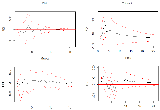 In Mexico, long-term imbalances in FDI positively affected EG, although it was significant only for the first lag. Long-term imbalances in EG had a positive effect on FDI in the first, second, fourth, and fifth lags, and it had a negative effect in the third lag. However, the effects were not statistically significant. In Peru, FDI responded positively to long-term imbalances in EG during the first two lags and negatively from the third to the sixth lag. However, the effects lack statistical significance. In contrast, EG responded positively to long-term imbalances in FDI. This effect was statistically significant for the first four lags.