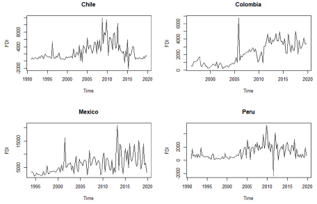 This study used a quarterly time series for FDI and EG in each PA country. FDI was measured as the quarterly flow of foreign investment in the host country in millions of dollars (constant prices of 2015), reported in the financial account liabilities of each country's balance of payments. Meanwhile, EG was measured as the quarterly real annual growth rate without carrying out a seasonal disaggregation. Data from the first quarter of 1991 to the third quarter of 2019 (115 observations) were used for Chile. For Colombia, data from the first quarter of 1996 through the third quarter of 2019 (95 observations) were used. Data from the first quarter of 1994 through the third quarter of 2019 (103 observations) were used for Mexico. For Peru, data from the first quarter of 1991 through the first quarter of 2017 (105 observations) were used. The data for this work were obtained from the International Monetary Fund (IMF) and the Economic Commission for Latin America and the Caribbean (ECLAC-STATS) statistics.