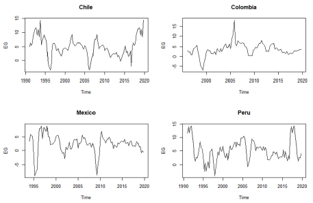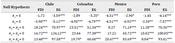 Having series with different orders of integration posed a great difficulty for the empirical analysis because cointegration tests could not be carried out. However, given that the series had a frequency greater than annual, it was possible to find behaviors in the variables that repeated periodically at the same times of the year (Alonso & Semaán, 2010). For this reason, the HEGY test was very important to identify the presence of seasonal unit roots and the appropriate way to obtain stationary series. Table 2 shows that in Chile, FDI had a non-seasonal unit root, while EG had no unit root. In Colombia, both FDI and EG had a non-seasonal unit root; therefore, it could be assumed that the series were I(1). In Mexico, FDI and EG did not have a unit root; thus, the series was considered stationary. In Peru, FDI had a non-stationary unit root every six months; for this reason, the series must be transformed through polynomials of the lag operator to obtain a stationary process. Moreover, EG had no unit root. There was mixed evidence on the order of EG integration in the countries. However, it was assumed that EG was 7(1) and, through the Johansen test, we could verify whether this assumption was adequate.