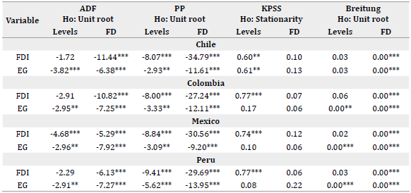 In order to analyze the stationarity of the series, it was crucial to have an idea of how the series behaved over time (Figure A1 and Figure A2). Based on this, unit root tests were performed to determine the order of integration of the series, as shown in Table 1. ADF, KPSS, and Breitung tests showed Chile's stationary FDI in its first difference. The KPSS and Breitung tests indicated that Chile's EG was stationary at its first difference. Therefore, it was concluded that in Chile the series were integrated of order 1, i.e., In Colombia, the ADF, KPSS, and Breitung tests indicated that FDI was However, all tests suggested that EG was stationary, i.e., I(0). In Mexico, the KPSS and Breitung tests indicated that FDI was while all evidence suggested that EG was I(0). In Peru, the ADF, KPSS, and Breitung tests showed that FDI was I(1) while the four tests indicated that EG was I(0).