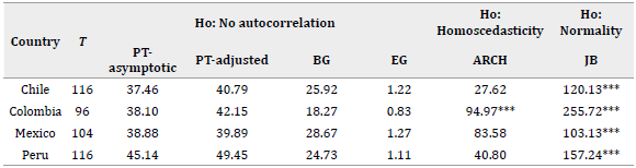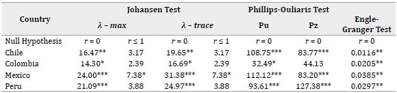 After determining the order of integration of the analyzed series, cointegration tests were performed in the framework of the estimation of a VAR model. Indeed, the VAR model was an indispensable input to apply Johansen's (1991) test for cointegration, Granger (1969) causality test, and the estimation of the VEC model and IRFs. Based on the information criteria, the appropriate model in Chile was VAR (4), in Colombia, VAR (3), and in Mexico and Peru, VAR (6). Additionally, the estimated VAR models met the stability assumptions corresponding to the absence of autocorrelation and heteroscedasticity, as shown in Table 3.