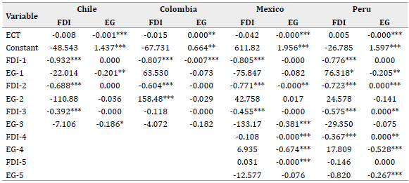 Considering that FDI and EG have a long-term relationship, it was possible to estimate a VEC model using each country's data to know how the variables adjust in short-term to long-term imbalances. Table 6 shows that in Chile, EG responded positively to long-term imbalances in FDI. This effect was statistically significant for the first three lags. However, long-term imbalances in EG did not significantly affect FDI. Therefore, the increase in EG did not contribute to attracting higher investment flows. In Colombia, on the other hand, EG responded negatively to long-term imbalances in FDI. However, the effect was significant only for the first lag. In turn, FDI responded positively to long-term imbalances in EG. In this case, the effect was statistically significant only for the second lag.