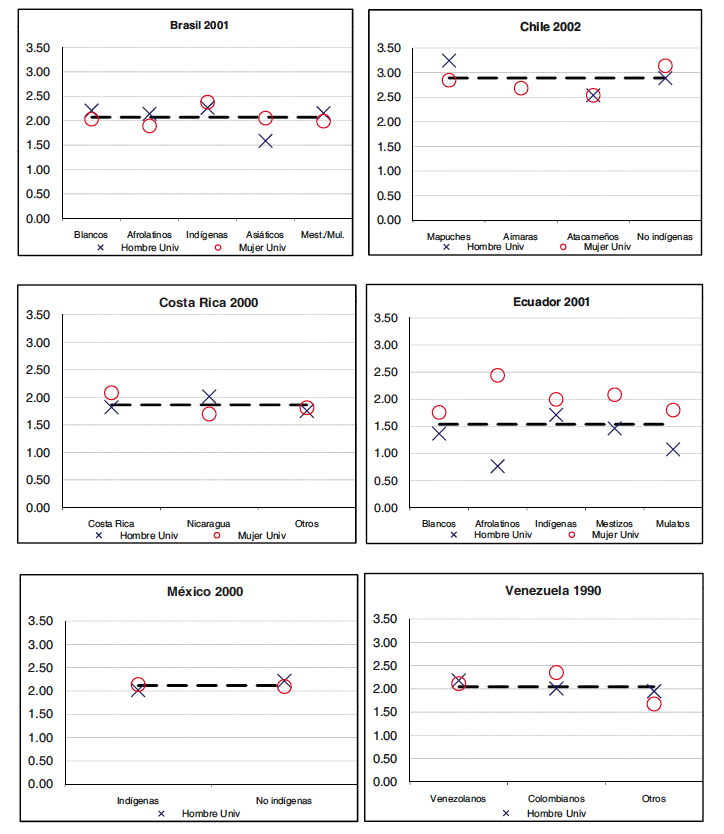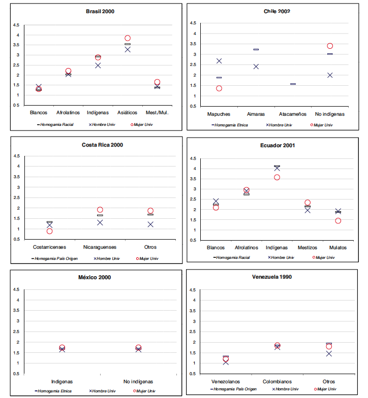 Asimismo, para el caso de Brasil, las propensiones entre hombres y mujeres tienden a ubicarse muy cerca del promedio general. Destaca el grupo de los hombres asiáticos con nivel universitario, quienes poseen una menor propensión hacia la homogamia educativa en relación con el conjunto, así como el caso de las mujeres indígenas que presentan relativamente una mayor propensión hacia la homogamia universitaria. En Chile, las mujeres pertenecientes al grupo mayoritario “no indígena” muestran una tendencia levemente mayor que los hombres hacia la homogamia. En el caso de los mapuches se da la situación inversa.