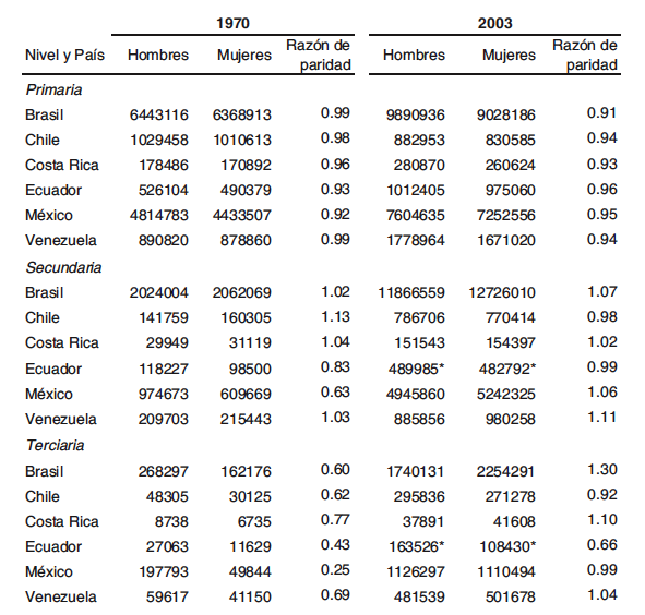 Fuente: CEPALSTAT: Estadísticas e Indicadores Sociales (BADEINSO).El hecho de que la educación superior fuera un ámbito especialmente reservado para los varones cuatro décadas atrás se refleja al comparar los altos valores del indicador obtenidos en la educación secundaria para 1970 en países como Brasil, Venezuela, Costa Rica y, especialmente Chile; con los bajos valores para ese mismo año en relación con la educación superior. En términos prácticos, podría suponerse que si bien es cierto que una mayor cantidad de mujeres poseían estudios secundarios en comparación con los hombres, también es cierto que una mayor cantidad de mujeres no continuaba sus estudios superiores, incrementándose en gran medida las diferencias entre ambos sexos.
