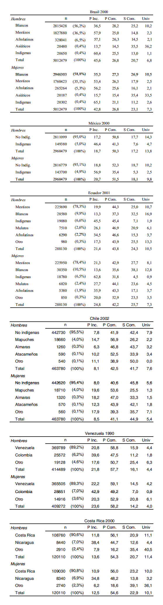 El cuadro 3 muestra la distribución de la población analizada en función del sexo, grupo de pertenencia y niveles de escolaridad. En síntesis, puede afirmarse que los datos agregados apoyan las tendencias descritas en el tercer apartado, relacionadas con la reducción de la brecha educativa entre hombres y mujeres en los distintos países. Sin embargo, al desagregar esta información con base en algunos ejes de desigualdad típicos de la región, tales como la etnia, raza o país de origen, es evidente que aún persisten desigualdades importantes. Por lo general, estas desigualdades tienden a concentrarse en los grupos indígenas, afrolatinos o inmigrantes. Asimismo, al interior de cada uno de estos grupos, las desigualdades de género en relación con los logros educativos tienden a manifestarse con mayor frecuencia.