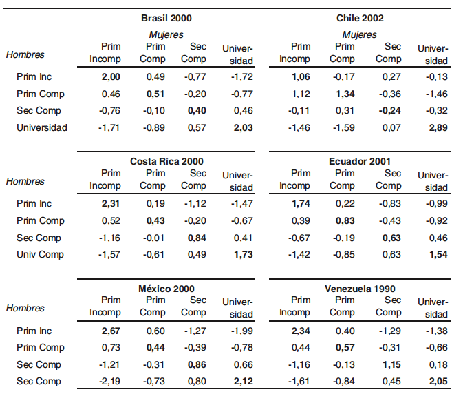 Sin embargo, el gráfico no nos aporta información acerca de cuáles son los grupos más propensos a la homogamia educativa. Por esta razón, en el cuadro 4 se presenta la intensidad de establecer relaciones homógamas entre personas de distintos niveles educativos, representada en términos de los logaritmos de las razones de verosimilitud (log odds). Aquí, los valores por encima de 0 indican que existe un mayor número de uniones homógamas de las que se hubieran obtenido si las personas se emparejaran al azar, mientras que los valores inferiores a 0 denotan un menor número de uniones. Los valores para cada país se representan en un conjunto de tablas de 2 por 2, en el cual los hombres se ubican en las filas y las mujeres en las columnas.