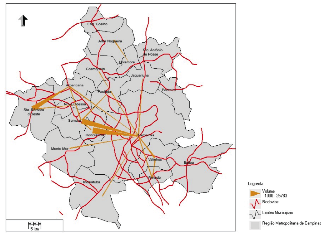 Considerando os fluxos de até 1000 pessoas para os municípios da RMC, pode-se constatar que estes envolvem um grande número de interações entre municípios metropolitanos, fato que dificulta a sua representação cartográfica. Deve-se considerar, no entanto, que não obstante esse grande número de interações, o maior volume de deslocamentos concentra-se em poucos fluxos, como fica demonstrado no Mapa 2. Nele estão representados apenas os fluxos que respondem por cerca de 75% de todos os deslocamentos pendulares que, como se pode notar, estão concentrados nos fluxos com destino em Campinas, o principal pólo da região metropolitana e, em menor escala, em Americana, que certamente se configura como um sub-pólo regional.