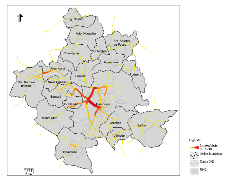 A partir de outra fonte de dados, a pesquisa Origem/Destino4 realizada em 2003 na região, fica muito claro o impacto desses fluxos diários de pessoas no sistema viário da região (Mapa 3).