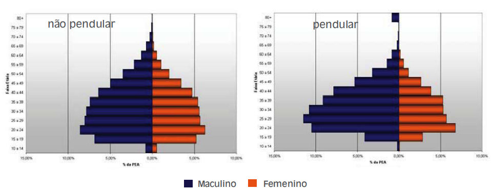 Comparando-se as duas pirâmides, nota-se em primeiro lugar, que a PEA “não pendular” apresenta um maior equilíbrio entre os sexos, ao contrário da PEA pendular, que apresenta uma maior proporção de homens. Em termos etários, a PEA “pendular” é mais concentrada a partir da faixa dos 20 a 24 anos até a faixa dos 30 a 34, a partir da qual as proporções decaem paulatinamente.