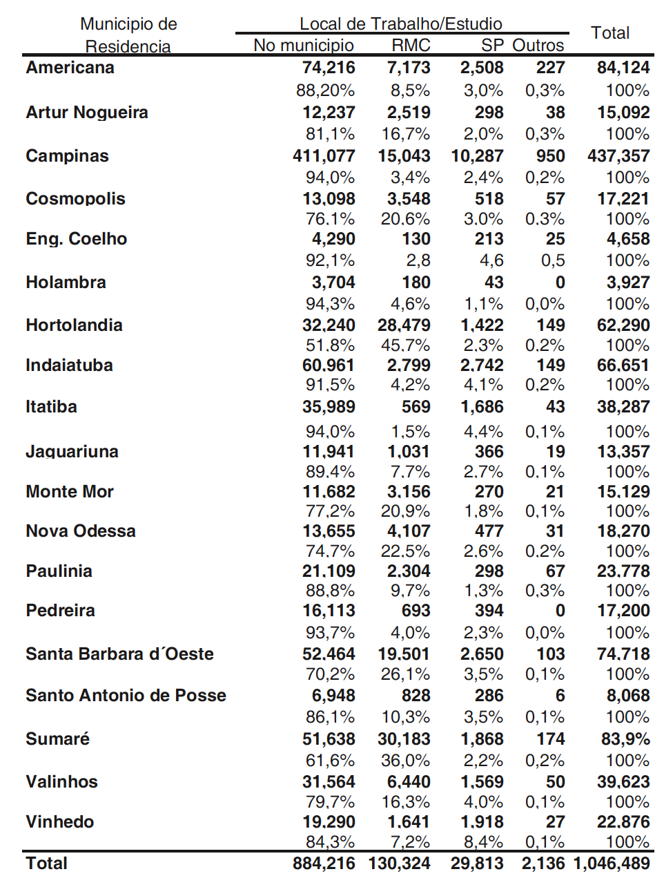 Segundo pesquisa recentemente realizada, diariamente na Região Metropolitana de Campinas, mais de 200 mil pessoas saíam de seus municípios de residência para trabalhar ou estudar em outro município, cifra que mostra um significativo aumento com relação àquela registrada pelo Censo de 2000 de aproximadamente 180 mil pessoas. Esse movimento era feito majoritariamente dentro da própria RMC, mas estende-se também para outros municípios do estado de São Paulo e até mesmo para outros estados. Por trás do deslocamento de um volume tão grande de pessoas há uma série de fatores, como a integração crescente do território metropolitano, a especialização funcional e interdependência dos municípios e a reorganização das atividades produtivas em uma nova base territorial de modo a otimizar vantagens locacionais. Tudo isso contribuiu para que uma parcela cada vez maior da população se deslocasse a distâncias crescentes em busca de trabalho e serviços específicos.