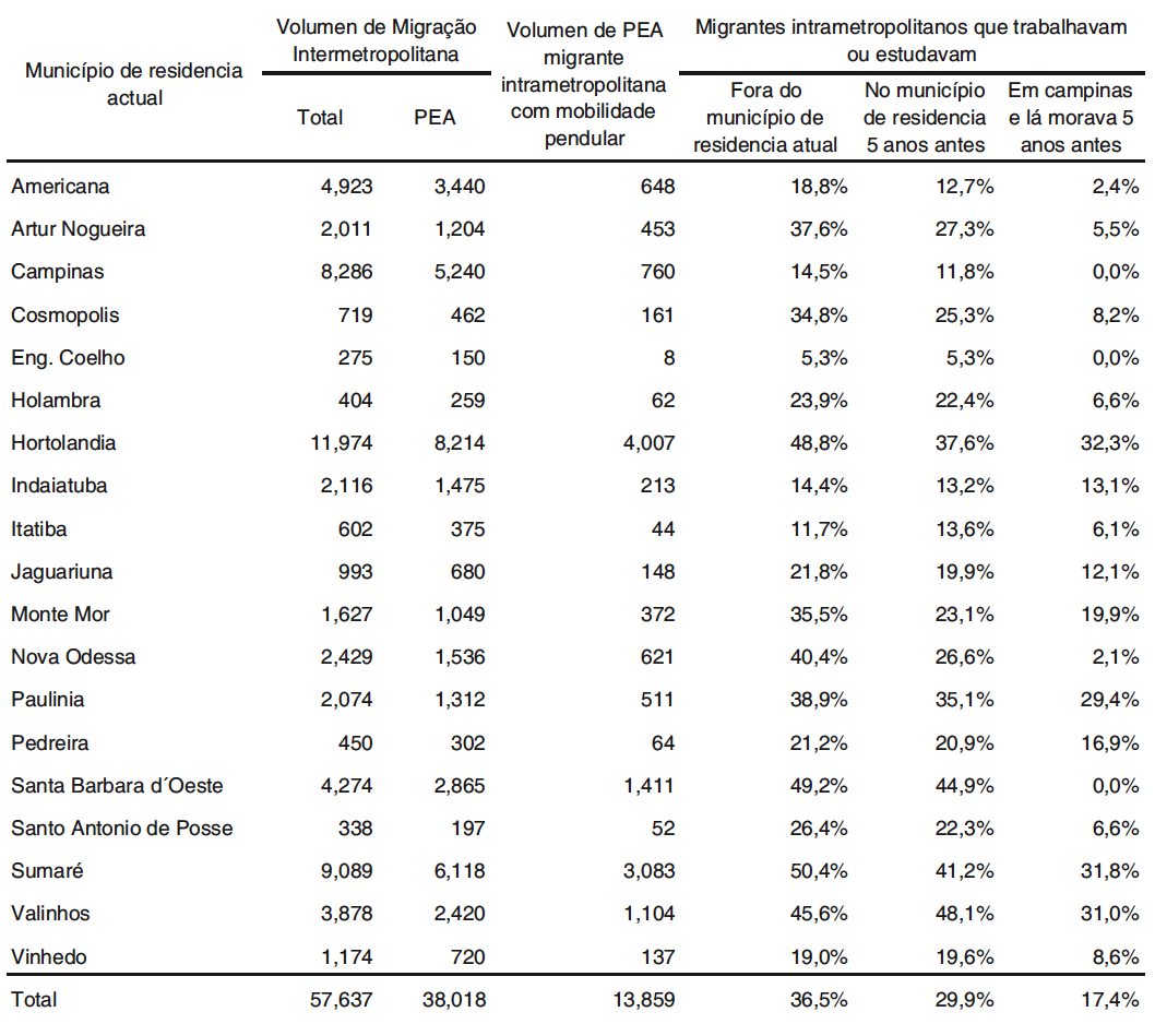 Se é verdade que, no caso da RMC, não se pode afirmar que a mobilidade pendular seja uma conseqüência direta e imediata dos deslocamentos daqueles que mudam de município dentro da região, tampouco se pode deixar de considerar a importância de deste último sobre a intensificação do primeiro.