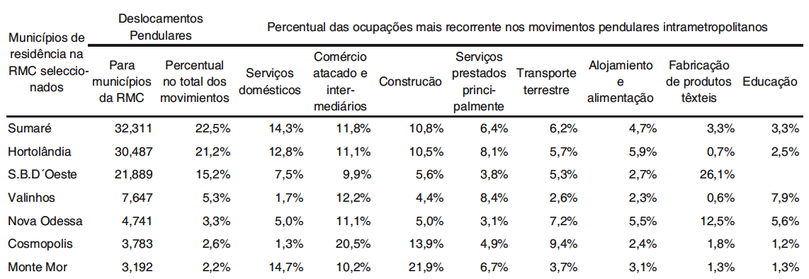 Tabela 7. Volume da mobilidade pendular intrametropolintana e ocupações mais recorrentes. Região Metropolitana de Campinas, municípios selecionados 2000