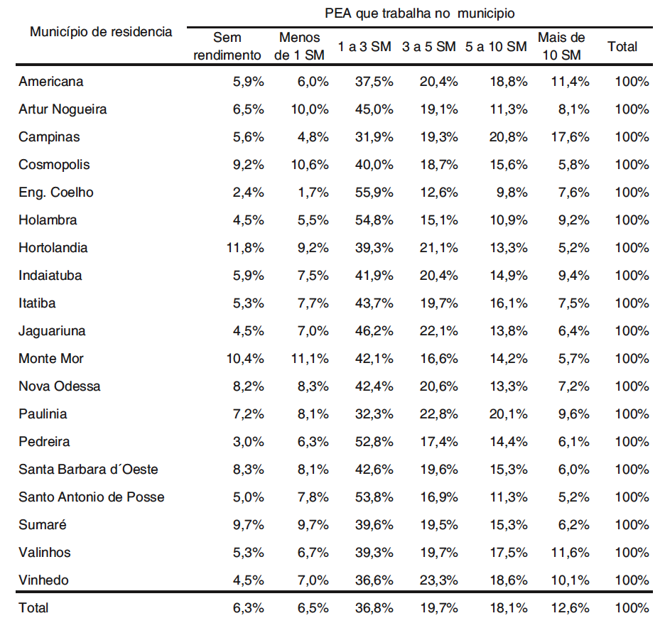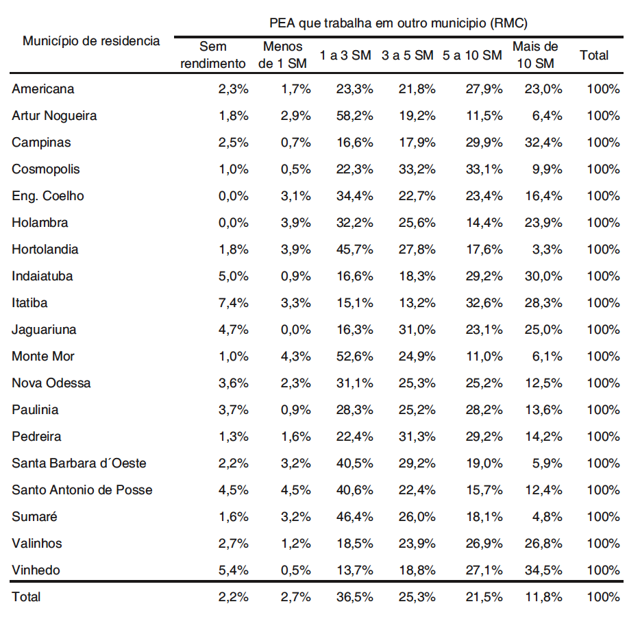 Em linhas gerais, esse estudo mostrou que a população economicamente ativa (PEA) que realiza deslocamento pendular possui um padrão de renda ligeiramente mais elevado que o da PEA não pendular, sendo que isso acontece mesmo nos municípios com padrão de renda mais baixo, como é o caso de Hortolândia, Sumaré e Santa Bárbara d’Oeste, dentre outros.