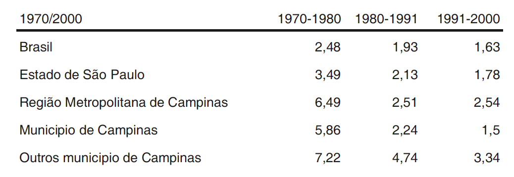 Tabela 1. Taxa de crescimento media anual Brasil, Estado de São Paulo e Região Metropolitana de Campinas 1970/2000