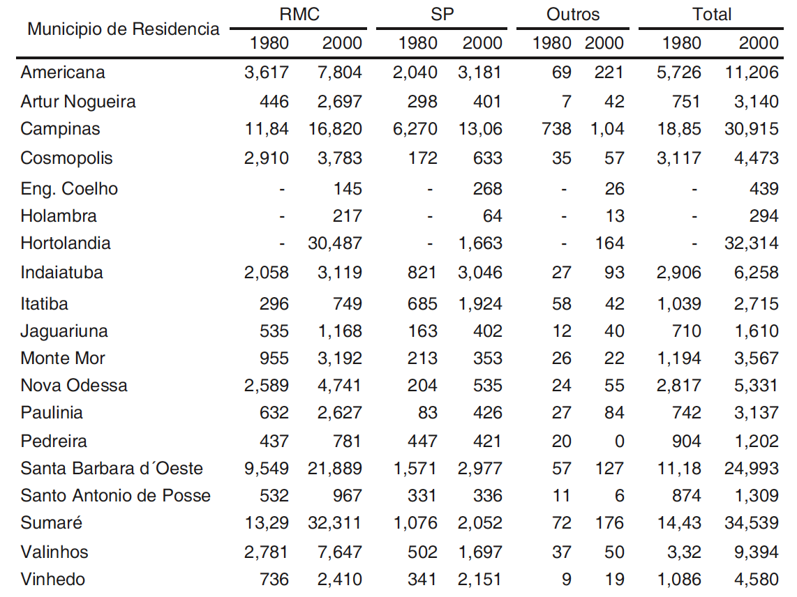 Esse fato está diretamente ligado ao processo de metropolização que transcorreu de forma mais visível durante esse período, configurando um padrão de trocas populacionais com base nas especificidades dos municípios em termos de empregos, moradia e serviços especializados. A Tabela 2 traz um panorama detalhado da evolução dos deslocamentos pendulares a partir dos municípios da RMC no período 1980-2000. Como se pode notar, o maior crescimento se deu nas trocas internas à RMC que passaram de 76% dos deslocamentos em 1980 para 79% dos deslocamentos em 2000. Os deslocamentos para os demais municípios do Estado de São Paulo aumentaram em volume durante o período, mas perderam participação relativa, caindo de 22% dos deslocamentos em 1980 para cerca de 20% em 2000. Analogamente, os deslocamentos pendulares para outras localidades fora do estado de São Paulo tiveram um aumento em números absolutos, mas também perderam participação relativa, limitando-se a 1% do total de deslocamentos. Esse mesmo padrão se repete e é até mesmo acentuado nos pelos dados mais recentes mostrando que, em 2007, quase 91% da mobilidade pendular se concentrava dentro da própria Região Metropolitana.