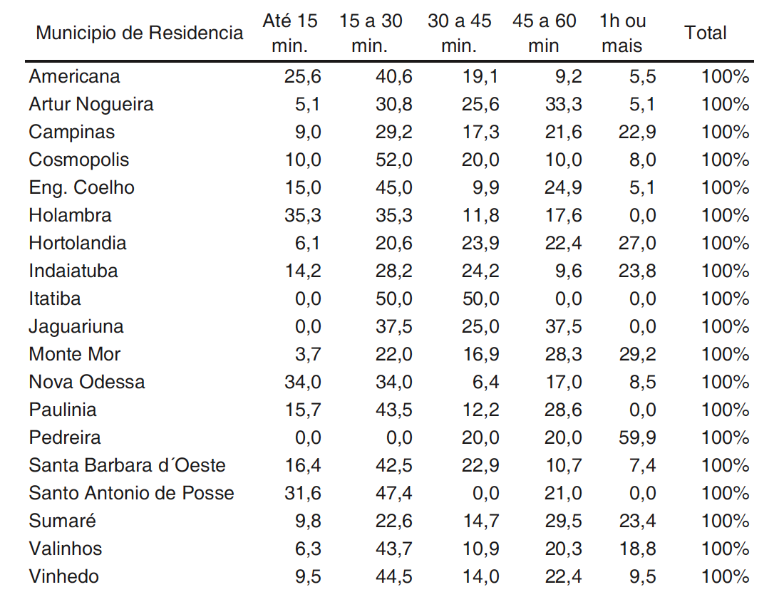 Nota-se, em linhas gerais, que a viagem dura até 45 minutos para a maior parte dessa população (cerca de 60%). Contudo, também percebe-se importantes diferenças na duração da viagem quando são observados os municípios de residência. No caso daqueles de onde partem os maiores fluxos, com destino em Campinas, ou seja, Hortolândia e Sumaré, há uma proporção elevada de pessoas (quase 50%) cujo deslocamento demanda mais de 45 minutos, o que leva a crer, se considerarmos que o mesmo tempo é gasto na viagem de retorno ao município de moradia, o tempo de deslocamento total possui um impacto significativo no tempo livre dessas pessoas. Com relação ao município de Santa Bárbara d’Oeste, a proporção de pessoas que gasta mais de 45 minutos se deslocando é bem menor, dada a proximidade com o município de Americana, que é para onde se destina majoritariamente o fluxo pendular.