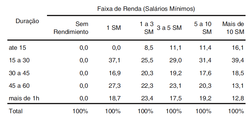 Os dados da tabela sugerem, portanto, que os deslocamentos de maior tempo de duração são, em geral, mais freqüentes entre as pessoas de mais baixa renda. De fato, é nítida a diferença entre os percentuais daqueles cujas viagens duram mais de 1 hora entre os mais pobres e mais ricos. Além disso, os dados dão conta de que as maiores proporções de pessoas cujo deslocamento é mais curto encontram-se preponderantemente nas categorias de renda acima dos 5 salários mínimos5.