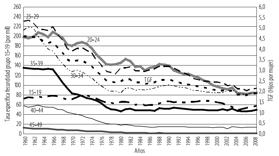 En conclusión, la fecundidad adolescente en Chile en los últimos 50 años ha tenido una trayectoria que se distingue de las otras edades por su resistencia a la baja. Por cierto, en comparación con 1960 (es decir, previamente al descenso acelerado y sostenido de la fecundidad total), es más baja en la actualidad. Pero su caída ha sido menos pronunciada que la de los otros grupos de edad y, además, tuvo una docena de años de alza (1987- 1999) que fue exclusiva de este grupo. Desde 1999 a 2004 cayó de manera importante, pero luego de esa fecha no ha seguido haciéndolo, pues experimentó un repunte. Esta tendencia de los últimos 50 años sugiere que, a pesar de la existencia de factores socioeconómicos que promueven una fecundidad controlada para todos los grupos de edad, los medios disponibles para ejercer ese control no han sido tan eficientes y efectivos entre las adolescentes.
