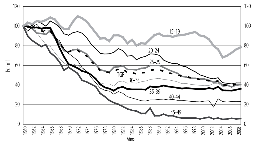 Gráfico 3. Tasas específicas de fecundidad por grupos quinquenales de edad (tasa de 1960 =100). Chile. Años 1960-2008