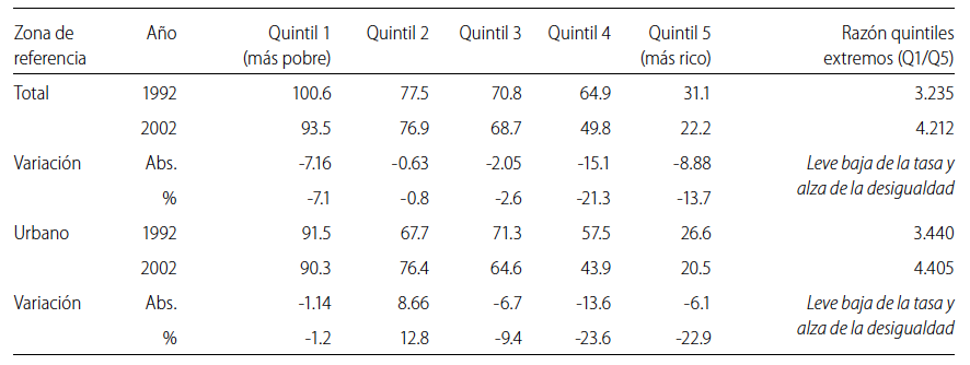 Por eso, en una investigación llevada a cabo por el Centro Latinoamericano y Caribeño de Demografía (CELADE) se emplearon quintiles socioeconómicos usando microdatos censales (para más detalles, véase CEPAL, 2005). Y las estimaciones indirectas de la tasa de fecundidad adolescente mostraron una leve caída entre 1992 y 2002.12 Pero, como esta caída fue más intensa entre los quintiles socioeconómicos superiores, la desigualdad socioeconómica de la fecundidad adolescente, en particular la razón entre quintiles extremos, aumentó (Cuadro 4), lo que no ocurrió con la fecundidad total (CEPAL, 2005, Cuadros III.8 y III.9).