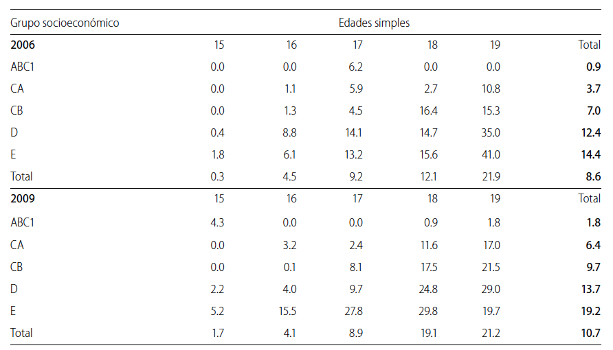 La base del análisis es el Cuadro 6, que muestra una marcada desigualdad socioeconómica de la maternidad adolescente, ya que esta aumenta, de manera bastante sistemática, a medida que el nivel socioeconómico disminuye. Para controlar el efecto de la estructura etaria, se tipificaron los valores de cada grupo usando la estructura etaria del grupo ABC1; los resultados muestran cambios ligeros (1.8, 5.8, 7.8, 12.0 y 17.6) y mantienen la tendencia al aumento de la maternidad adolescente con la reducción del nivel socioeconómico.