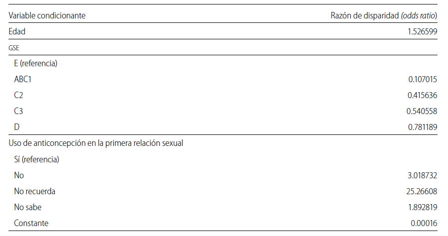 Por último, en el Cuadro 7 se presenta un modelo de regresión logística con el objetivo de evaluar si la protección anticonceptiva tiene efectos netos del factor socieconómico, controlando por el factor edad. Los resultados muestran lo ya sabido: la chance de experimentar maternidad adolescente aumenta con la edad (casi un 100% al pasar de un año a otro, mero efecto del mayor tiempo de exposición al riesgo al evento), y se reduce significativamente con el nivel socioeconómico; en efecto, la chance de ser madre adolescente entre el grupos ABC1, controlando la edad, es solo una décima parte de la del grupo E.