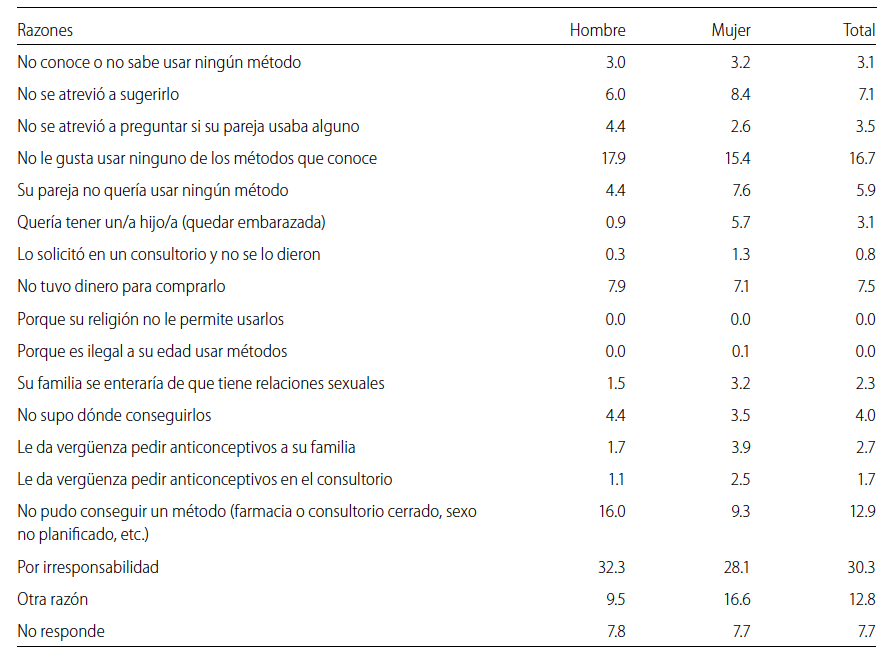 Considerando la importancia de esto último, en el Cuadro 8 se tabulan las respuestas a la consulta sobre las razones para no haber usado anticoncepción en la última relación sexual. Claramente sobresalen cinco razones: irresponsabilidad, incomodidad, falta de acceso oportuno (combinación de barrera de acceso y falta de planificación), carencia de recursos y déficit de empoderamiento (menciones a no uso porque “la pareja no quería”). El desconocimiento y el deseo de embarazo son marginales. Este conjunto de antecedentes novedosos y recientes simplemente refuerza lo ya dicho: a) la acción pública es imprescindible no solo por las adversidades y las inequidades de la reproducción temprana sino también porque es básicamente no deseada;17 b) la acción pública tiene que ser integral y sensible a las especificidades de los/as adolescentes, dada la diversidad y complejidad de razones para el no uso de anticonceptivos.