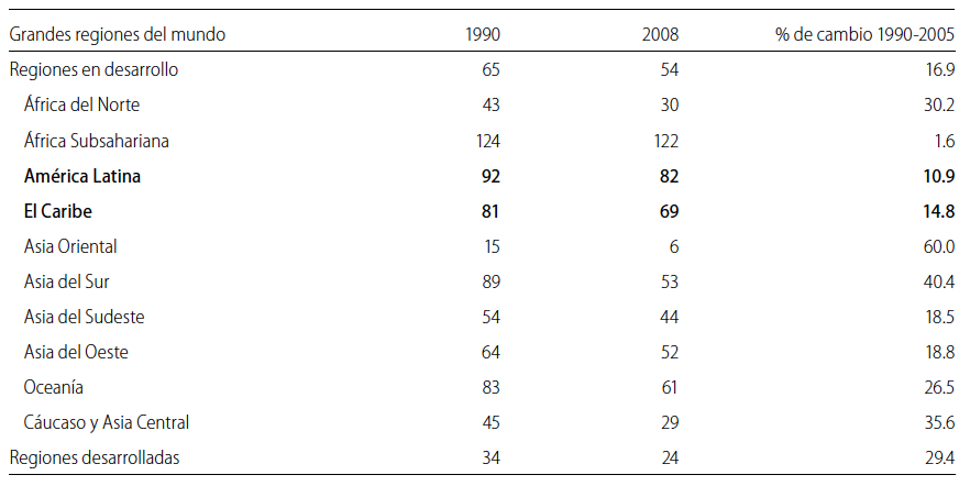 América Latina sobresale a escala mundial por presentar una fecundidad adolescente relativamente elevada -en la actualidad, solamente África subsahariana tiene un nivel superior- y por exhibir el segundo menor descenso entre 1990 y 2008 (10.9%) (Cuadro 1).
