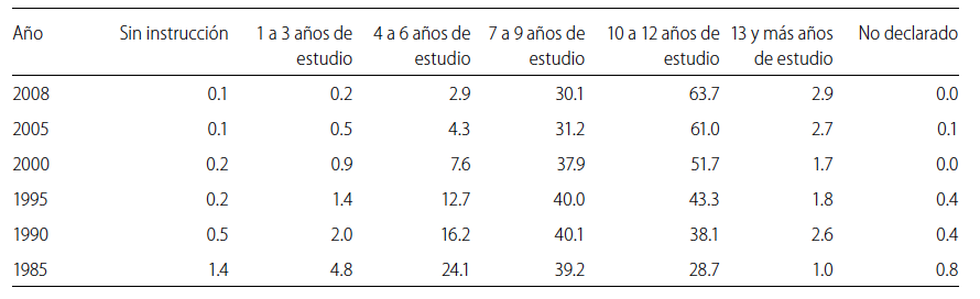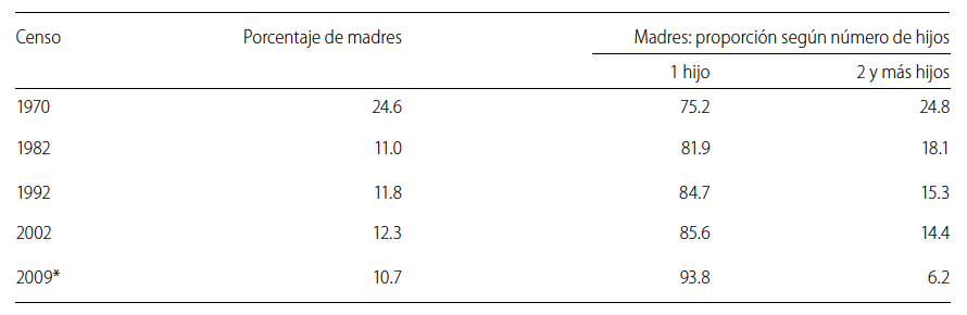 Fuente: Para 1982, 1992 y 2002: Rodríguez, 2005, Cuadro 4 (procesamiento de microdatos censales); para 1970: Tomo de resultados finales del Censo, Cuadro Nº 38; para 2009: procesamiento especial de la VI ENAJU.