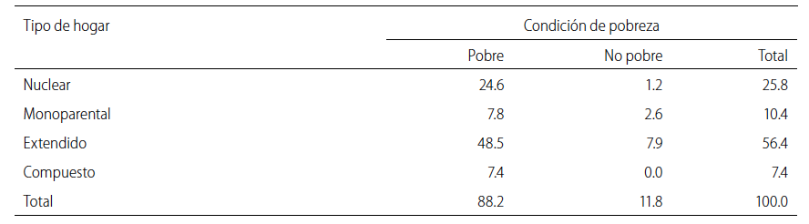 Las adolescentes madres viven mayoritariamente en hogares extendidos y compuestos (56.4% y 7.4%, respectivamente). Las que conviven solas con su pareja son el 26%, mientras que el 10% forma un hogar monoparental, vale decir que el 36% forma un hogar propio. El caso de las madres en hogares monoparentales revela que una de cada diez madres está asumiendo sola la crianza del hijo. La composición de los hogares nos estaría señalando que, para la mayoría de las jóvenes, el nacimiento del hijo en la adolescencia no implica la formación de un hogar propio y que, por tanto, no se traduce en una transición hacia la independencia del hogar de origen –es decir, la asunción del rol adulto de la maternidad no se ve acompañada, en la mayoría de los casos, por la asunción de un rol de adulto independiente del hogar paterno–. También se observa la conjunción entre pobreza y dificultades para la independencia del hogar de origen: del total de madres, casi la mitad (48.5%) no solo vive en hogares extendidos sino que además vive en condiciones de pobreza. La condición de privación social es el contexto predominante en las jóvenes que inician la reproducción en esta etapa del ciclo de vida (Cuadro 5).