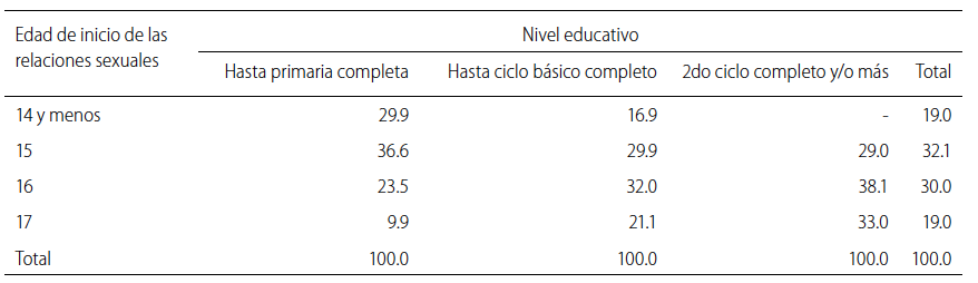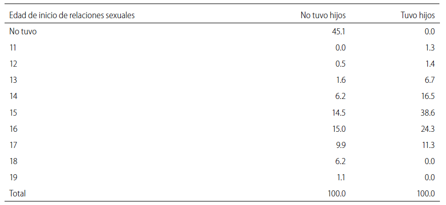 La edad de inicio de las relaciones sexuales es una variable intermedia relevante en el estudio de la maternidad adolescente: una edad temprana implica un riesgo potencial de inicio precoz de la reproducción, incluso en la primera adolescencia. Entre las adolescentes que no son madres, casi la mitad no se inició sexualmente (45%) y el 38% lo hizo con 16 o menos años. En contraposición, el 89% de las madres se inició a los 16 o menos años (Cuadro 7).