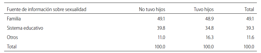 En sus declaraciones, todas las adolescentes (madres y no madres) manifiestan haber tenido acceso a las fuentes de información sobre sexualidad. La mitad expresa que recibió algún tipo información de su familia, algo más de la tercera parte declara que se la proporcionó el sistema educativo y entre un 11 y un 16% señala que la obtuvo de otros informantes (Cuadro 11).