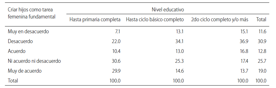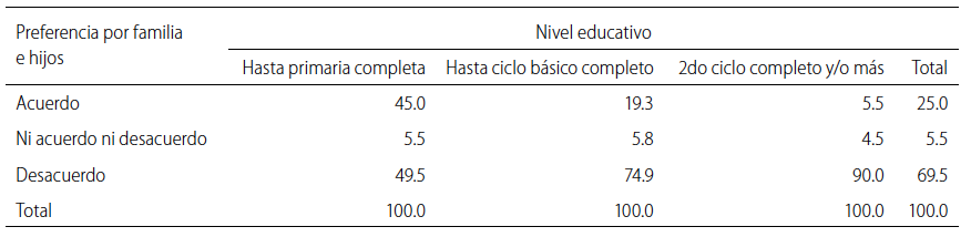 Estas imágenes intervienen en la concepción de las mujeres sobre el papel preponderante que deben desempeñar en su vida, y que entre las de baja educación se vincula mayoritariamente con la maternidad y la crianza de los hijos. Como lo muestra el Cuadro 14, las adolescentes que tienen hasta primaria completa se dividen en partes iguales entre aquellas que prefieren atender a su familia en lugar de trabajar y las que no lo prefieren. Entre las que tienen nueve años de educación el desacuerdo con esta afirmación alcanza a las tres cuartas partes; y entre las más educadas al 90 por ciento.
