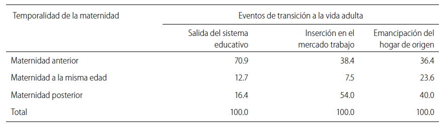 Apreciamos que entre las jóvenes que fueron madres, un 71% abandonó los estudios antes de experimentar la maternidad, mientras que un 13% lo hizo a la misma edad en que tuvo su hijo y solamente un 16% abandonó o terminó los estudios con posterioridad a la maternidad. En cuanto a la inserción en el mercado de trabajo, un 38% de las jóvenes comenzó a trabajar antes de ser madres y la mayor parte (54%) lo hizo con posterioridad. En el caso de la emancipación del hogar de origen, podemos observar que un 37% de las jóvenes que fueron madres formó un hogar independiente antes de convertirse en madre, un 24% lo hizo a la misma edad en que tuvo su hijo y un 40% formó un hogar independiente con posterioridad al nacimiento.