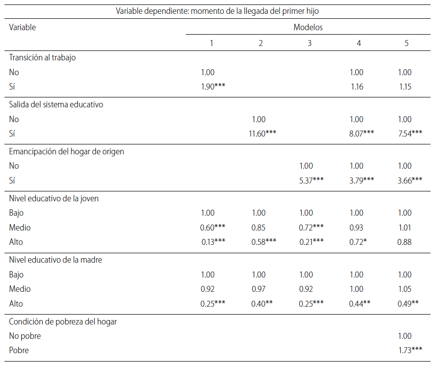 Todas las variables de transición son significativas al máximo nivel de significación estadística en los primeros modelos. Las variables de control tienen el sentido esperado en los modelos que consideran cada transición por separado: de manera general, a mayor nivel educativo de la joven y de la madre, el riesgo de realizar la transición al primer hijo en la adolescencia disminuye. El nivel educativo de la madre solo reduce de manera significativa el riesgo de hacer la transición a la maternidad en esta etapa de la vida cuando se trata del nivel más alto de educación, es decir, por lo menos la secundaria completa.