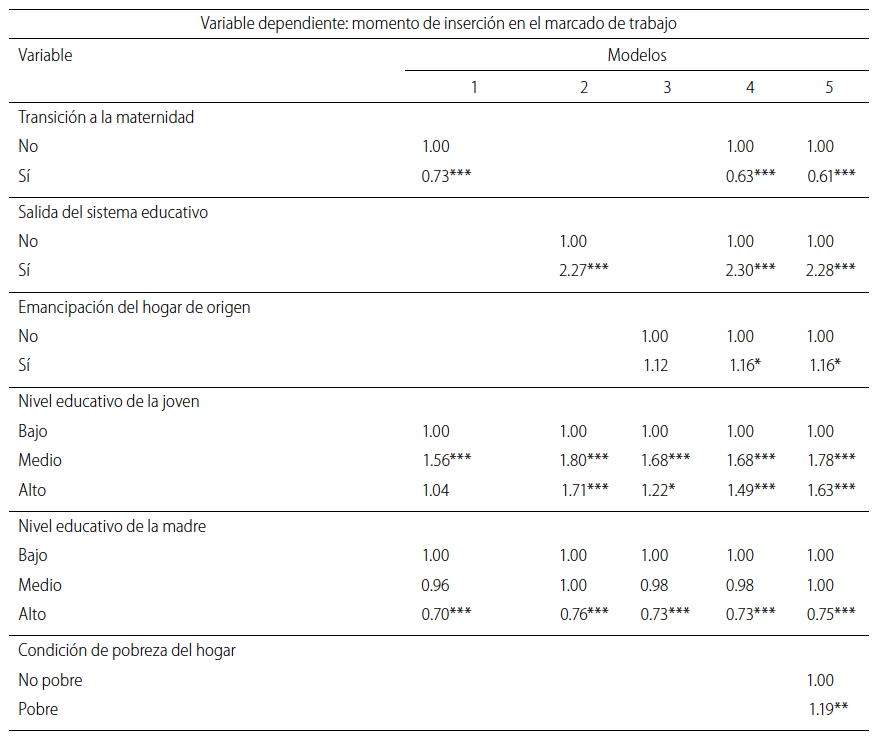 Fuente: Procesamiento de microdatos de INE 2008: Encuesta Nacional de Adolescencia y Juventud.Por el contrario, el haber hecho la transición a la maternidad en la adolescencia disminuye el riesgo de insertarse en el mercado de trabajo aproximadamente entre un 30% y un 40%, tanto considerado de manera independiente (modelo 1) como en simultáneo con el resto de los eventos del pasaje a la vida adulta (modelos 4 y 5). La salida del sistema educativo duplica el riesgo de comenzar a trabajar en todos los modelos. La emancipación del hogar de origen no muestra diferencias significativas cuando es considerada de manera independiente (modelo 3) y tiene un cociente levemente positivo en el resto de los modelos. Las variables de control actúan en el sentido esperado: las jóvenes cuyas madres son más educadas tienen un menor riesgo de realizar una transición temprana al mercado de trabajo. La educación de las jóvenes, por el contrario, aumenta las chances de insertarse en el mercado de trabajo, en comparación con la categoría de referencia, esto es, las jóvenes con un muy bajo nivel educativo (hasta primaria completa). En el modelo 5, donde observamos además el impacto de la pobreza sobre esta transición, vemos que la condición de pobreza del hogar aumenta levemente este riesgo.