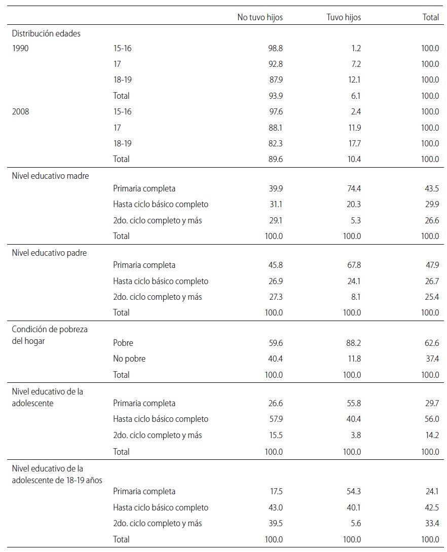 Cuadro 2. Perfil sociodemográfico de adolescentes madres y no madres (porcentajes). Uruguay. Años 1990-2008