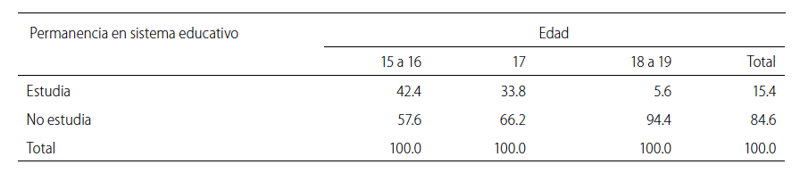 A ese bajo nivel educativo, se agrega el hecho de que, en la mayoría de las madres, hay una situación de abandono escolar. Particularmente se destaca que entre las más jóvenes más de la mitad no estudia –siendo que los 15 y 16 años es la edad de estar cursando tercer y cuarto año de la secundaria–. Entre las de 17 años es aún más alto el porcentaje de las que no estudian (66%). Es relevante el alto porcentaje de adolescentes madres entre 18 y 19 años que no permanece estudiando (94.4%); en su gran mayoría estas jóvenes alcanzaron un bajo nivel educativo: primaria o primaria y ciclo básico –vale decir, a lo sumo nueve años de educación (Cuadro 3).
