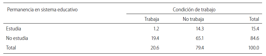 En relación con lo mencionado, se observa que la mayoría de las madres no trabaja (79.4%). Como veremos más adelante, la transición temprana a la maternidad no va de la mano de una inserción más rápida en el mercado laboral (Cuadro 4). La vida cotidiana de las madres adolescentes se centra en la maternidad: el 65% ni trabaja ni estudia, lo que implica que fundamentalmente están recluidas en el ámbito doméstico; tan solo el 14% estudia; y solamente el 19% trabaja.