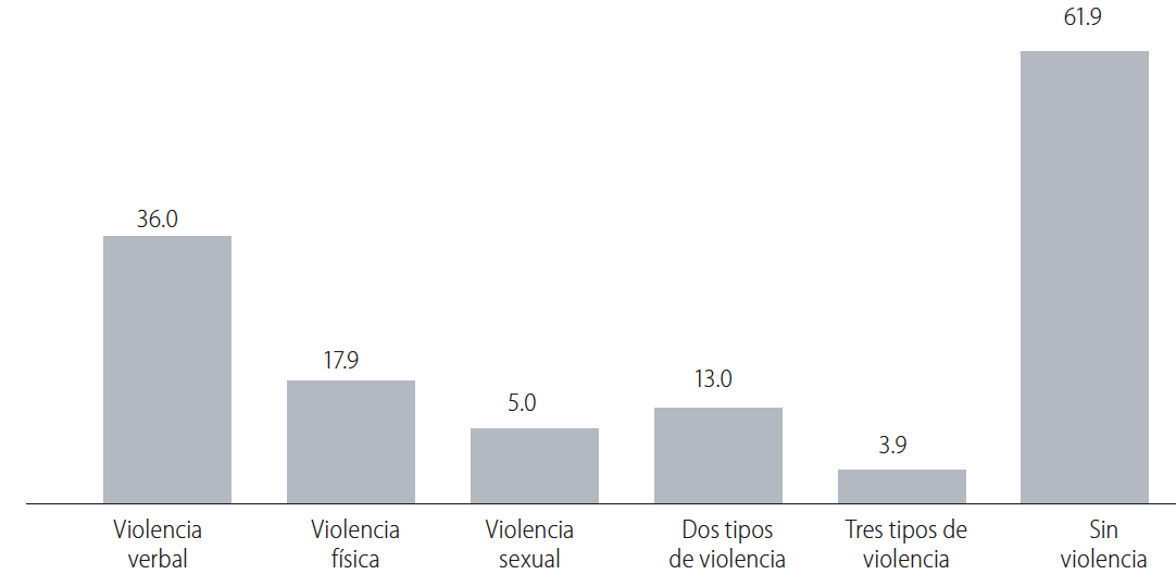 A medida que aumenta la edad, crece la prevalencia de la violencia verbal, física y sexual: en el caso de las mujeres que reportaron dos tipos de violencia, las diferencias según edad son pequeñas, mientras que, entre quienes refirieron haber sufrido los tres tipos de violencia, la prevalencia se incrementa a medida que aumenta la edad.10
