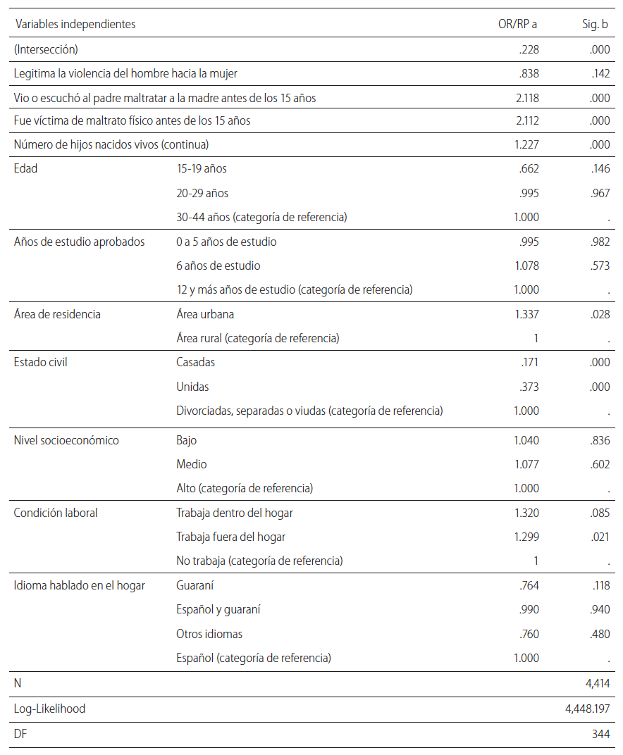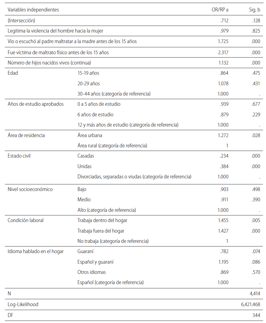 Las variables independientes correspondientes a factores individuales son: haber visto o escuchado al padre o padrastro maltratar a la madre antes de los 15 años (variable dicotómica); haber sido víctima de maltrato físico antes de los 15 años (variable dicotómica); edad (variable categórica que incluye tres grupos etarios: adolescentes –15-19 años–, mujeres en la edad reproductiva central –20-29 años– y mujeres al final de su edad reproductiva –30-44 años–);6 años aprobados de estudio (variable categórica que incluye tres grupos: 0-5 años de estudio, 6-11 años de estudio y 12 y más años de estudio); número de hijos vivos (variable continua); y, finalmente, condición laboral de la mujer (variable categórica que incluye: trabaja dentro del hogar, trabaja fuera del hogar y no trabaja). La variable referida a la relación o pareja es el estado conyugal (variable categórica: casada, unida, divorciada, separada, viuda).