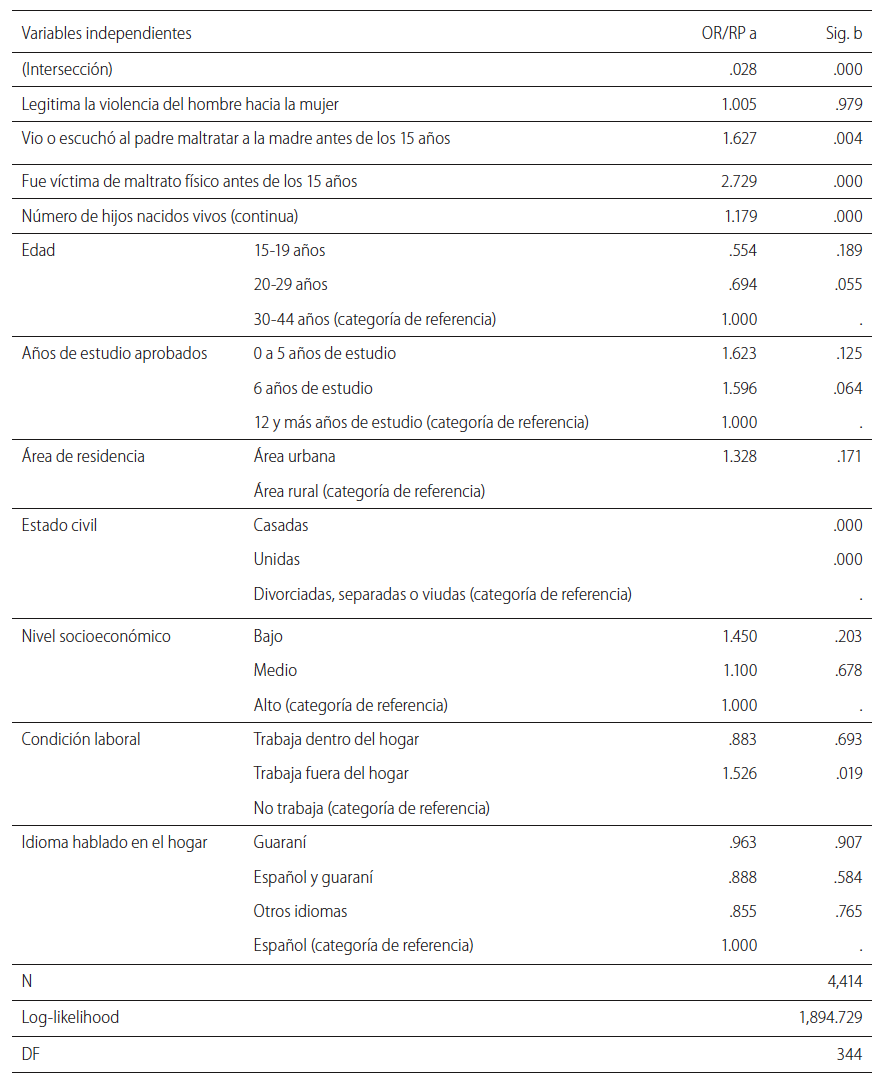 El análisis de regresión para la violencia física dio como resultado cinco variables de riesgo. Las mismas fueron: haber visto o escuchado al padre/padrastro maltratar a la madre/madrastra antes de los 15 años; haber sido víctima de maltrato físico antes de los 15 años; un mayor número de hijos; residir en áreas urbanas; y tener un trabajo extradomiciliario. Las mujeres que vieron o escucharon al padre/padrastro maltratar a la madre/ madrastra antes de cumplir los 15 años tendrían un riesgo 1.12 veces mayor que las que no tuvieron esa experiencia. Las mujeres que fueron víctimas de violencia física antes de los 15 años tendrían un riesgo 1.11 veces mayor de victimización que aquellas que no lo fueron. Cada hijo adicional incrementaría el riesgo, con una razón de probabilidad de 1.23. Las mujeres urbanas tendrían un riesgo 1.34 veces mayor que las mujeres rurales. Finalmente, las mujeres con un trabajo extradomiciliario al momento de la encuesta resultaron tener un riesgo de victimización por violencia física superior en 1.3 veces respecto de las mujeres que no trabajan.