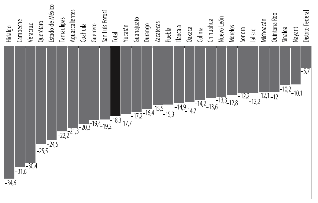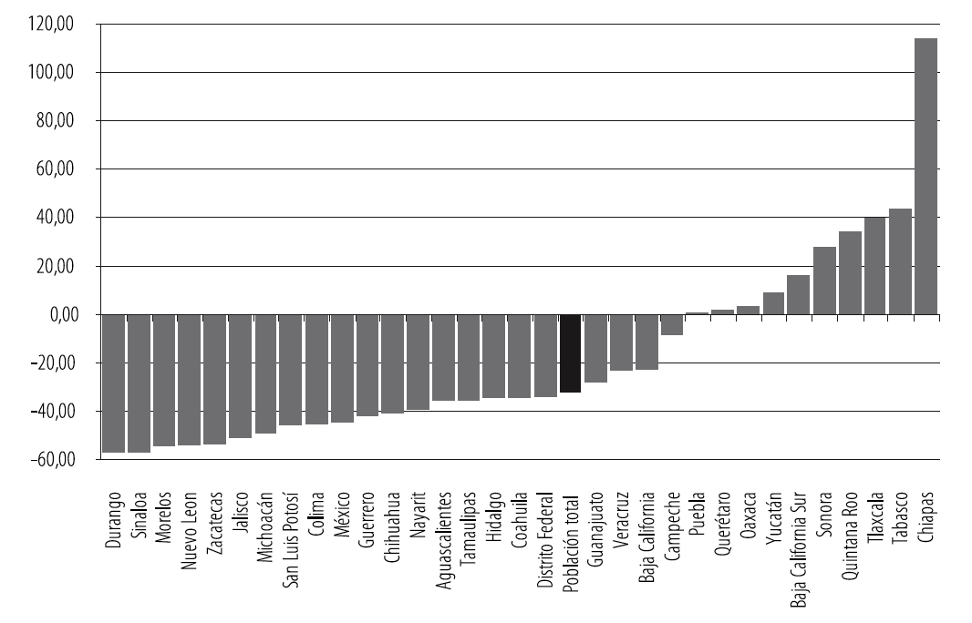 La desaceleración de la población migrante se registró en veintidós entidades federativas, que presentaron un cambio porcentual negativo entre un quinquenio y otro. Entre los estados que observaron tal disminución, se encuentran entidades de tradición migratoria, como Jalisco (-51.1%), Michoacán (-49.17%) y Guanajuato (-27.85%), así como estados emergentes, entre ellos la entidad mexiquense (-44.25%) (Gráfico 1), donde existen comunidades que se han extendido entre ambos países para asegurar el sustento económico, creando hogares transnacionales (González, 2002), los cuales, actualmente, viven situaciones de vulnerabilidad debido a la contracción de la migración y de las remesas, que se habían instituido entre las principales estrategias económicas familiares.
