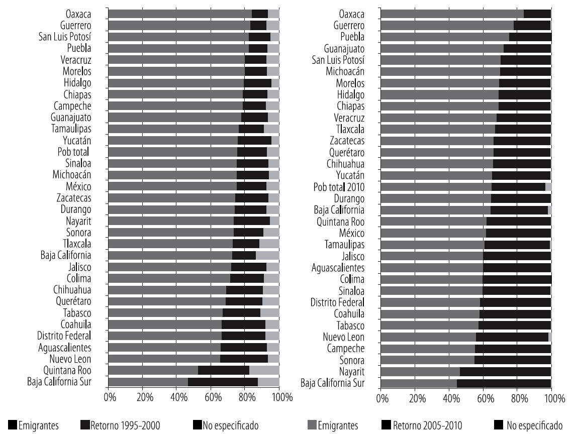 Por otro lado, los cambios recientes en los procesos migratorios de los mexicanos se relacionan con el incremento en el porcentaje de emigrantes retornados, el cual pasó de 17.4% (284,806) a 31.5% (350,719) de la población migrante internacional en los quinquenios 1995-2000 y 2005-2010. Específicamente, por entidad federativa, se observa un importante ensanchamiento en la cantidad de emigrantes retornados de los EUA en los períodos referidos, como ocurre en el Estado de México, donde el porcentaje pasó de 20% a casi 40%, mientras que en Baja California Sur, Nayarit, Sonora, Campeche y Nuevo León se elevó a poco más del 40% (Gráfico 2).