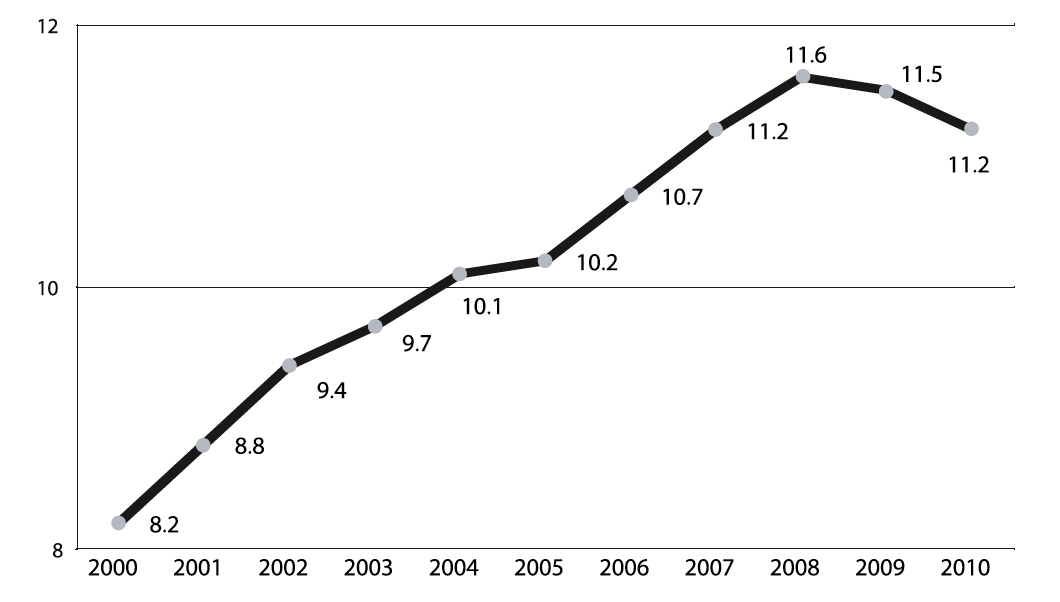 En su conjunto, la desaceleración en el flujo de migrantes mexicanos hacia los EUA, el pausado incremento en el retorno de los procedentes de ese país y el aumento de las deportaciones han llevado a una disminución de los inmigrantes mexicanos en EUA. Al respecto, se estima que el número de mexicanos radicados en el vecino país registró un crecimiento acelerado e ininterrumpido hasta abril de 2008, pasando de aproximadamente 800 mil personas en los años setenta a 10.2 millones en 2005 y 11.2 millones en 2007(Corona y Huerta, 2009); pero estimaciones recientes señalan que esa población está experimentando una disminución en su ritmo de crecimiento (Lozano, Huesca y Valdivia, 2010): entre 2008 y 2010 se redujo de 11.6 a 11.2 millones de individuos (Passel y Cohn, 2009; Passel, 2010) (Gráfico 3).